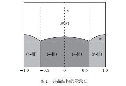 假设由α和β两相组成的片层共晶以拉度V向液相稳定推进,共晶片层与固-液界面垂直.选取固-液界面处α相片层的中心为坐标原点,x轴与片层垂直,z轴与晶体生长方向平行,如图1所示.共晶界面用函数z=h(x,t)表示,它也是共晶生长解的一部分.