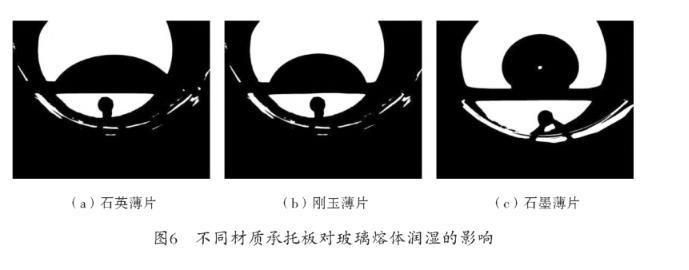 在相同温度条件下探究石英材质、刚玉材质和石墨材质对玻璃熔体润湿的影响,结果如图6所示。玻璃熔体与石英薄片和刚玉薄片润湿铺展,而石墨薄片不润湿铺展,故石墨可作为测量玻璃熔体表面张力的承托板材料[11]。此外石墨材料也要有足够的光滑度,表面质量差的石墨承托板会对玻璃熔体成球形状产生影响。就工业生产的高纯石墨材料产品而言,要选取符合GB/T 30071—2013要求的表面平整度小于0.04 mm,粗糙度小于0.02 mm的高纯石墨材料[12]。
