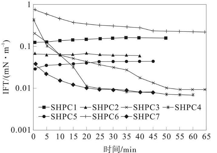 将SHPC1~7活性体系溶液配制为浓度大小为0.25%的溶液,密闭24 h,然后利用Texas-500C界面18luck国际对界面张力进行动态测定,从而得到图2所示的结果。