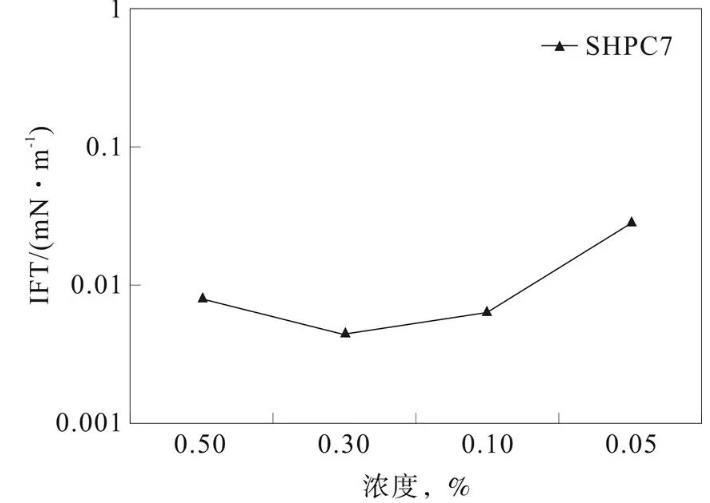 通过上述的图可以看出,当SHPC7浓度在0.05%的时候,此时的界面张力最差,油水界面张力保持在10-2mN/m的数量级。而当浓度在0.3%的时候,此时的油水界面张力在10-3mN/m的数量级。由此可以看出,当SHPC7的浓度在0.3%的时候,其界面张力最小,满足试验油田样品的驱油需求。