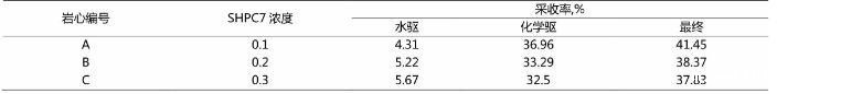 由此,通过表2看出,在增大SHPC7表明活性剂的浓度下,其驱油效果在不断增加。但是在0.3%的浓度下其驱油采收率小于浓度为0.2%的采收率。根据上述的结果得出,在实际的应用中,应选择SHPC7表明活性剂浓度大小为0.2%的浓度,此时采收率最高。
