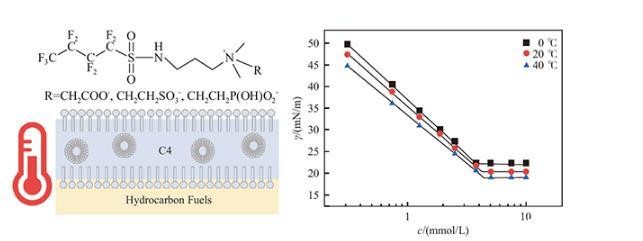然而不同温度对表面活性剂的性能可能有一定程度的影响。尤其是机场消防领域,由于我国机场分布较广,消防车灭火需要就近取水,各机场在冬季和夏季的消防用水水源温度差异较大(一般在0~40℃)。在低温下氟碳表面活性剂的性能可能会受到影响,进而影响AFFF的灭火性能。我国国标中也仅对泡沫在室温下的性能指标有所要求,并未严格考虑温度的影响。因此,将温度作为影响因素进行研究,能够指导表面活性剂的有效应用。本文在温度为0~40℃的范围下,研究三种接枝不同亲水基团的基于短碳氟链的甜菜碱型两性氟表面活性剂的一系列理化性质,为此类表面活性剂在不同温度环境下的应用提供理论依据。