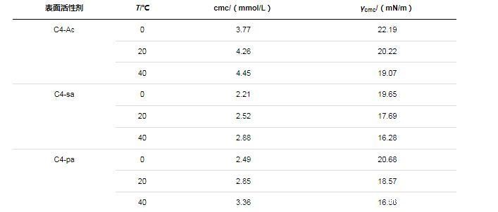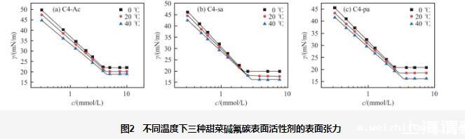 表1不同温度下甜菜碱氟碳表面活性剂临界胶束浓度和最低表面张力