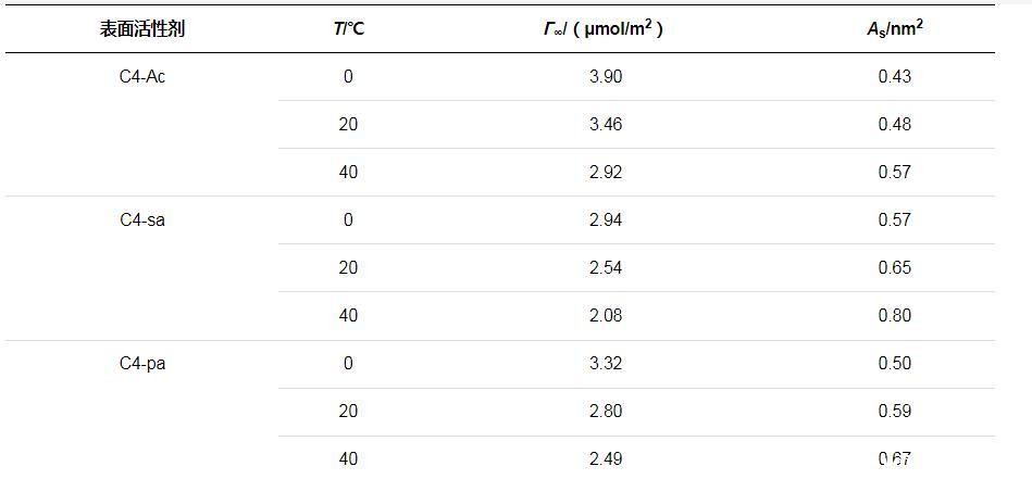 通常较高的Γ∞和较低的AS值表明表面活性剂分子密集地排列在空气与水的界面上,由上述公式计算得到三种表面活性剂的Γ∞和较低的AS值如表2所示。对比参数可知,同种表面活性剂的Γ∞均随温度的升高而减小,AS有所增大,吸附表面的分子排布较为松散。这是由于温度较高的情况下表面活性剂分子热运动加剧,更易从吸附界面上脱离,并且因无规则运动导致吸附分子所占面积增大了。温度升高导致溶解度的增加,因而表面的Γ∞会有所减小。由于Γ∞还受到表面张力随浓度变化曲线斜率的影响,因此所得趋势是综合影响的结果。此外,由表中还可以看出,C4-sa分子的Γ∞最小,AS最大,在溶液表面的排列更加松散。这可能是由于亲水端磺酸基团之间强静电排斥力,并且空间位阻较大。