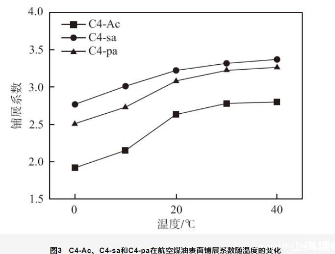 图3 C4-Ac、C4-sa和C4-pa在航空煤油表面铺展系数随温度的变化