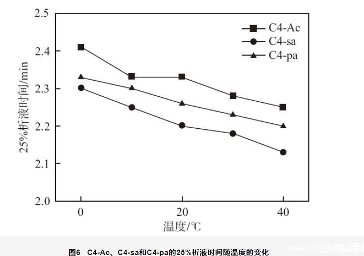 图6 C4-Ac、C4-sa和C4-pa的25%析液时间随温度的变化