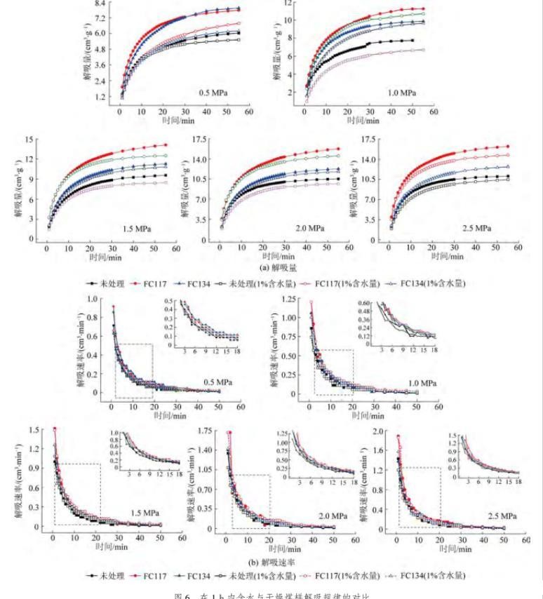 为了得到气润湿反转剂处理前后含水(1%含水率)煤样的解吸规律,依次对不同吸附平衡压力条件下的煤样进行解吸试验,通过对比干燥与含水煤样的解吸量和解吸速率,进而定量分析气润湿反转剂消除水锁效应,如图6所示。