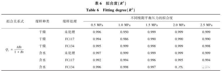 由表6可知,利用王佑安式拟合不同平衡压力条件下的解吸量与时间关系曲线,得到曲线的拟合度。其中,气润湿反转剂处理前后含水煤样的拟合效果最好,拟合度均大于0.99。在干燥煤样中,FC134处理后的煤样拟合度最好,不同吸附平衡压力条件下的拟合度均大于0.99;其次是未处理和FC117,拟合度也比较好,除去未处理煤样中吸附平衡压力为1.0 MPa,其余均在0.98以上。