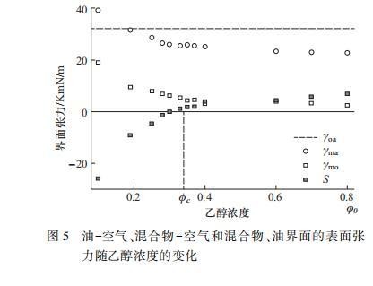图5油~空气、混合物~空气和混合物、油界面的表面张力随乙醇浓度的变化
