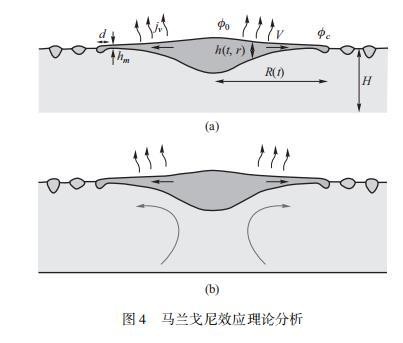 马兰戈尼效应是指由于表面张力不同的二种液体的界面存在表面张力梯度而使质量传送的现象。出现马兰戈尼效应的原因是表面张力大的液体对其周围表面张力小的液体的拉力强,产生表面张力梯度;使液体从表面张力低的方向向表面张力高的方向流动。此时引入马兰戈尼效应,就是对前文所说理论的一个形象简洁的概括。当酒精浓度超过某一阈值,液滴扩散。酒精蒸发液滴外围较薄的区域变得富含水,当外围局部浓度小于阈值,扩散停止。空间上不均匀的混合物浓度产生沿液滴半径的表面张力梯度,它们将溶质从油滴中心向外驱动。蒸发优先消耗位于边缘附近的液滴最薄部分的酒精,而乙醇含量的变化导致朝向液滴边缘的界面张力增加。这些梯度会在混合空气和混合油界面处产生马兰戈尼切向应力,从而驱动从液滴中心到外围的径向流动。液滴边缘脱湿和向外的马兰戈尼流动效应的结合导致液滴的外围形成较厚的边缘,从而变得不稳定,分裂成无数的小液滴,产生液滴爆炸的物理现象。马兰戈尼效应示意图如图4所示,黑箭头代表蒸发量和厚度的径向减小,灰色箭头代表液滴中马兰戈尼应力与油层中的黏性应力平衡,导致大量流动。h(r,t)是液滴的厚度剖面,R(t)是中心液滴的半径,H是油面厚度。