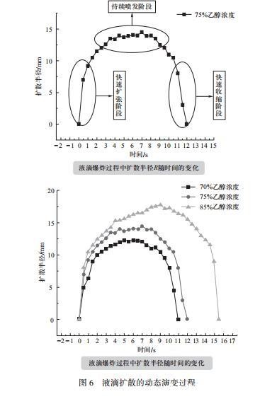 实验1探究液滴扩散的动态演变过程就是将前文用文字性描述的液滴扩散现象定量处理,用数据清晰的看出液滴爆炸过程中扩散半径随时间的变化,如图6所示,可以从折线图中直观看出液滴爆炸的三个过程。