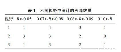 实验三探究影响最终液滴大小的参数,这里以75%乙醇浓度为例,说明测量碎裂液滴大小的方法。观察多个视野,将视野内的液滴划分为四类,显微镜下观察到的液滴通过三点共圆确定液滴半径,并测出各自半径R(单位mm)随机选取中部3个面积相同(A=πr2=2 mm2)的典型视野,统计各个视野中不同大小的液滴数量。最终加权求平均得到R平均=0.0743 mm=74.3μm.