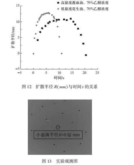 故本文将选择不同黏度梯度的疏水性物质进行实验。采用蓖麻油和花生油进行试验,蓖麻油的黏度(1452.91 mm2/s)远大于花生油(108.34 mm2/s),当乙醇浓度为70%时,在蓖麻油上最终液滴的半径接近0.01 mm,远小于对应花生油的测量值0.0743 mm.分析实验数据得到结论:微观上黏度增大会导致最终形成的液滴减小,宏观上黏度越大,液滴爆炸总时间越长,最大扩散半径越小。