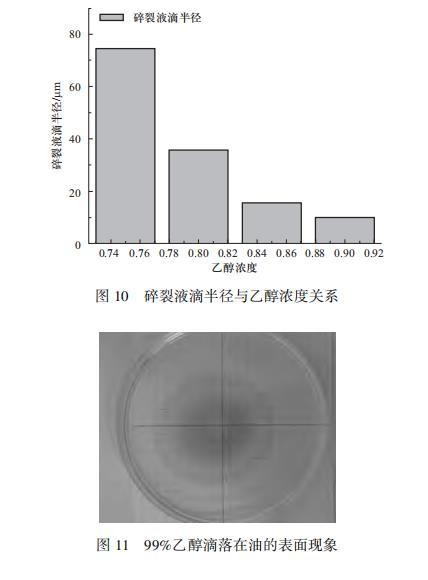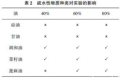 接下来再探究疏水性物质种类对液滴爆炸的影响,疏水性物质有很多种,在实际实验中不可能将所有的疏水性物质一一尝试,所以要找出选择有限疏水性物质种类的标准。本文开始选择了五种疏水性物质进行尝试,实验表明(如表2所示):对于硅油池与甘油池,没有一个案例表现出液滴的扩散;对于食用调和油、菜籽油池,40%、60%和80%乙醇溶液液滴在降落到油池上后均立即自发地进行扩散;对于蓖麻油池只有40%乙醇溶液无液滴爆炸现象产生。由此可以得出液滴只在特定种类疏水性物质上“爆炸”,并猜测与油的黏性有关。