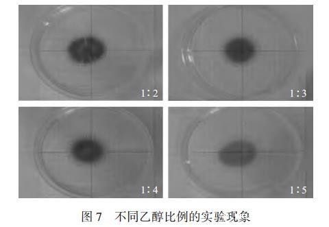 实验7改变温度。改变温度首先探究改变环境温度,如图16所示,分别是60%酒精溶液在培养皿底座为10℃、20℃、35℃下,实验进行至30 s时的扩散现象图。由实验可见温度的差异引起液滴爆炸的现象有显著不同。温度越高分裂越剧烈,反应扩散的速度越快,分裂出的液滴小,数量越多,反之亦然。