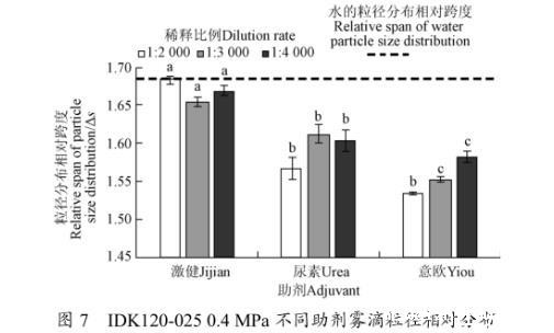 3)IDK120-025型喷头,0.4 MPa压力下。激健在配比1:3 000条件下,相比于自来水雾滴体积中径增大20.43%,雾滴粒径相对分布跨度减小1.74%。尿素与意欧溶液在配比1:2 000条件下,相比于自来水雾滴体积中径分别增大16.92%、11.10%,雾滴粒径相对分布跨度分别减小6.92%、8.86%,在增大雾滴体积中径的同时有效改善雾滴分布质量,增大雾滴飘移可控性。