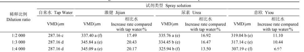 同一配比浓度下3种助剂溶液相比,激健溶液VMD最大,其次是尿素溶液。1:3 000配比时激健溶液相比于水将雾滴体积中径增大20.43%,意欧溶液仅增大10.44%。尿素与意欧溶液在配比1:2 000时分别将粒径增大16.92%、11.10%。