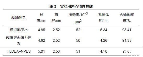 通过岩心动态驱替实验评价体系提高采收率的能力,实验装置见图1。采用不间断驱油的方式,以0.3 mL/min的注入流量驱油。分别考查模拟地层水、HLDEA+NPES体系和超低界面张力体系的驱油性能。实验用岩心物性参数见表3。实验的具体步骤如下。