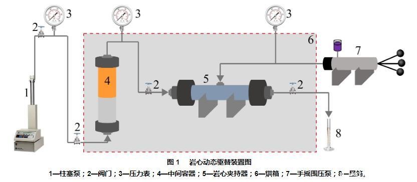 1—柱塞泵;2—阀门;3—压力表;4—中间容器;5—岩心夹持器;6—烘箱;7—手摇围压泵;8—量筒。