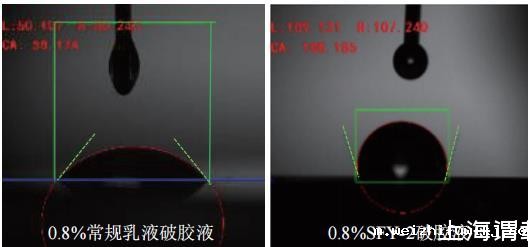 测试配方和测试结果见表3。几个配方压裂液均可在2 h内彻底破胶,并且破胶液黏度低,中黏液破胶液表面张力低至26 mN/m,提高返排性能的同时,破胶液对煤岩表面具有一定的表面修饰、润湿性改善作用,接触角由常规压裂液的50°左右提高到80°以上,最高可达108.2°,如图3所示。