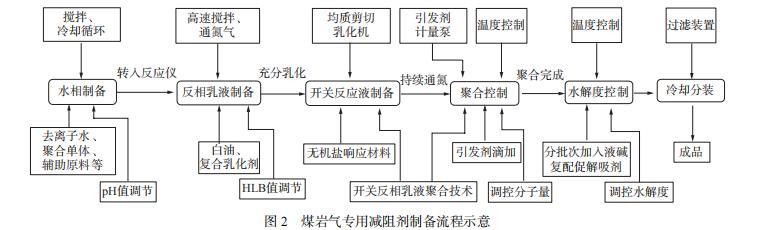 通过对水相制备—反相乳液制备—开关反应液制备—聚合控制—水解度控制—后处理等—系列过程中pH值、HLB值、引发剂、温度等的控制,形成煤岩气专用减阻剂制备流程,如图2所示。