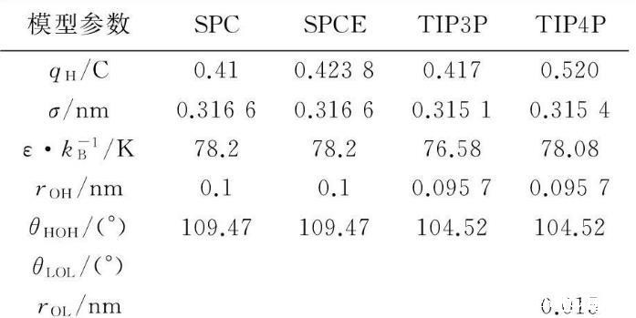 水分子模型很多,如SPC、SPCE、TPI3P和TPI4P等,其结构示意图和模型参数分别见图3和表1。水分子的势能函数如式(1)所示。
