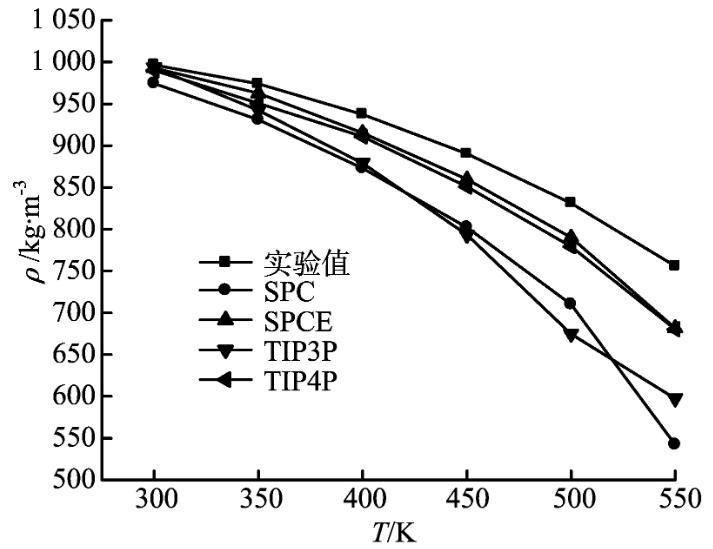 选择SPC、SPCE、TIP3P和TIP4P为水分子模型,分别在300、350、400、450、500和550 K的温度下进行MD模拟,盒内水分子共有1 372个,选择NVT系综,截断半径是12 nm。通过模拟得到纯水体系的密度分布、界面厚度和界面张力。