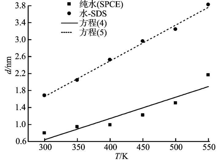 界面厚度取从水相体相密度的90%到表面活性剂体相密度的90%。模拟水分子数N1=3 000,十二烷基硫酸钠数N2=20,在温度T=300、350、400、450、500和550 K时,模拟得到界面厚度,将其与纯水体系的界面厚度对比,如图9所示。从图9可以看出,水—表面活性剂体系的界面厚度随温度的增加而增加,而且和纯水体系的界面厚度对比可知,水—表面活性剂体系的气—液界面厚度明显增大。同时,对纯水体系和水—表面活性剂体系的界面厚度模拟值进行拟合可分别得到式(4)和(5)。