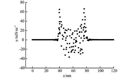 模拟水分子数N1=3 000,十二烷基硫酸钠数N2=20,温度T=300 K,水—表面活性剂体系的局部界面张力见图10。由图10可知,从汽相主体向液相过渡过程中,界面张力值逐渐增加,在气—液界面区达到峰值;在液相主体又在零值附近波动。