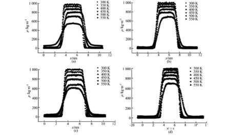 模拟分子数N=1 327,四种水分子模型分别在温度T=300、350、400、450、500和550 K时,模拟得到的密度分布如图4所示。从图4可以看出,曲线可以划分为三个部分,分别为汽相主体、液相主体以及气—液界面层。随着温度的增加,液相主体密度逐渐降低,气相主体密度逐渐升高,气—液界面区域逐渐变宽。