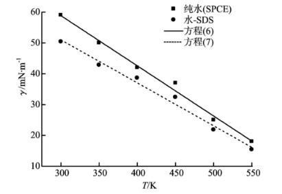 从图11可以看出,水—表面活性剂体系的界面张力随温度的升高而降低,而且加入十二烷基硫酸钠后水的界面张力明显降低。对纯水体系和水—表面活性剂体系的界面张力模拟值进行拟合可分别得到式(6)和(7)。