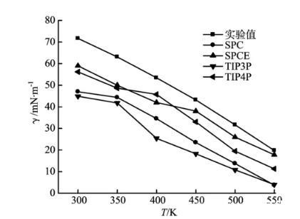 四种水分子模型分别在温度T=300、350、400、450、500和550 K时,模拟得到界面张力,如图7所示。从图7中可以看出,随着体系温度的升高,界面张力降低,并且模拟值与实验值之间误差逐渐减小。SPCE模型得到的界面张力与实验值的误差较小。