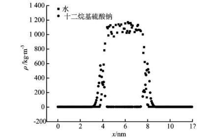 向纯水中加入十二烷基硫酸钠表面活性剂,水分子3 000个,十二烷基硫酸钠20个,模拟得到300 K下水—表面活性剂体系的密度分布,如图8所示。由图8可见,对于只有水的体系来说,其密度变化基本是符合由汽相到液相逐渐增加的趋势,而对于加入的表面活性剂十二烷基硫酸钠的体系来说,其密度的变化情况与只有水的体系有明显的不同。从图8可以看出,在气—液两相的过渡区域,加表面活性剂的体系密度出现明显的增长。