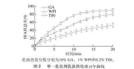 乳液粒径大小是评价乳液物理特性的重要指标之一,可判断乳化剂的乳化活性。在脂肪消化过程中,乳液的比表面积决定了胆盐、脂肪酶在油-水界面的吸附位点,因此乳液粒径大小对脂肪消化速率影响显著。如图1所示,10%GA、1%WPI和0.2%T80制备乳液的粒径分布基本一致,可保证乳液液滴的比表面积一致,消除乳液粒径对脂肪消化速率造成的影响。后续实验均采用此乳化剂质量分数。