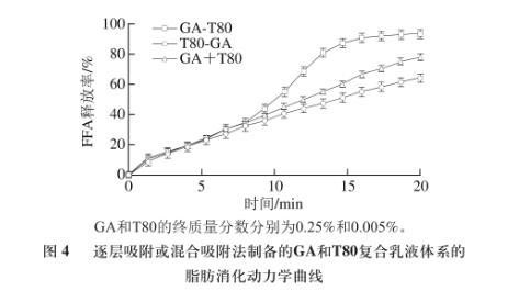 图4逐层吸附或混合吸附法制备的GA和T80复合乳液体系的脂肪消化动力学曲线