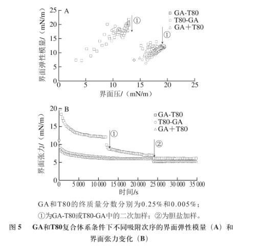 图5 GA和T80复合体系条件下不同吸附次序的界面弹性模量(A)和界面张力变化(B)