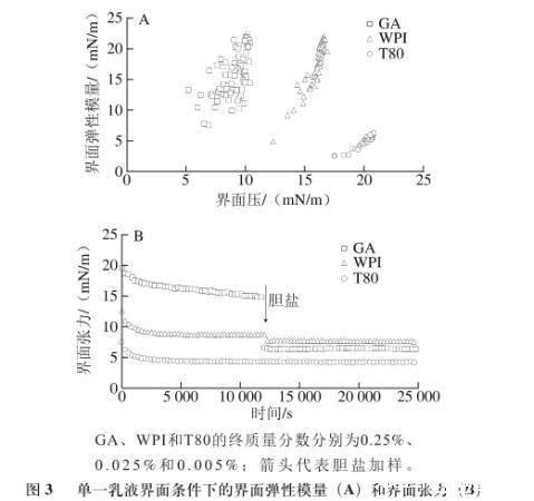 由图3A可知,GA和WPI界面的弹性模量值基本一致,比T80界面的弹性模量值高很多。说明此质量分数条件下GA和WPI形成的界面相对T80有更好的界面黏弹性。这是由于大分子GA和WPI具有较强的空间位阻,在乳滴界面可形成较厚的吸附层,乳滴空间稳定性较好,可在一定程度上抵御外力造成的变形。T80属于小分子表面活性剂,在界面吸附致密整齐,但乳滴的空间稳定性较差,易发生变形和聚集。图3B表明,在加入胆盐后,GA界面的界面张力降低值ΔT为8.42 mN/m,T80界面的界面张力基本不变,WPI界面的界面张力降低值ΔT为1.09 mN/m,由此证明T80的抗胆盐取代能力最优,其次为WPI和GA。3种乳化剂所呈现的界面特性与3种乳液的消化动力学规律相吻合。采用界面流变技术可有效评价乳化剂的界面特性,肠液组分对乳滴界面特性造成的影响以胆盐取代最为显著。因此,通过评价胆盐在界面的取代能力,可在一定程度上判断乳液的脂肪消化动力学规律。