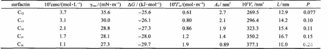 由一系列表面活性素溶液表面和界面活性实验可以看出,随着表面活性素脂肪链长度的增加,使得表面活性素的表面、界面活性加强,更有助于胶束的形成。