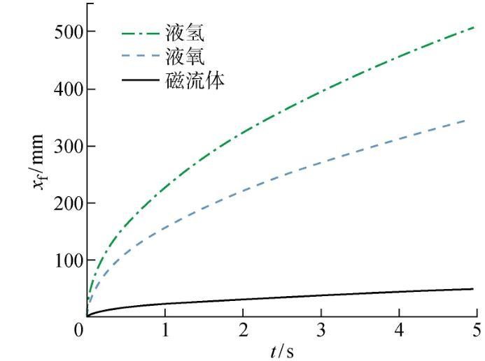 液氢、液氧等低温推进剂由于黏度小,其在内角毛细流动流量上高于磁流体一个数量级以上。尽管液氢的表面张力小,但其低黏度的特性在微重力流动中起主导性作用,导致其内角流动速度高于液氧和磁流体。