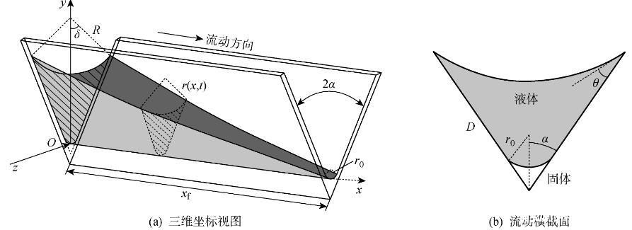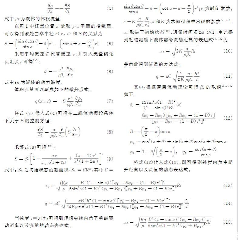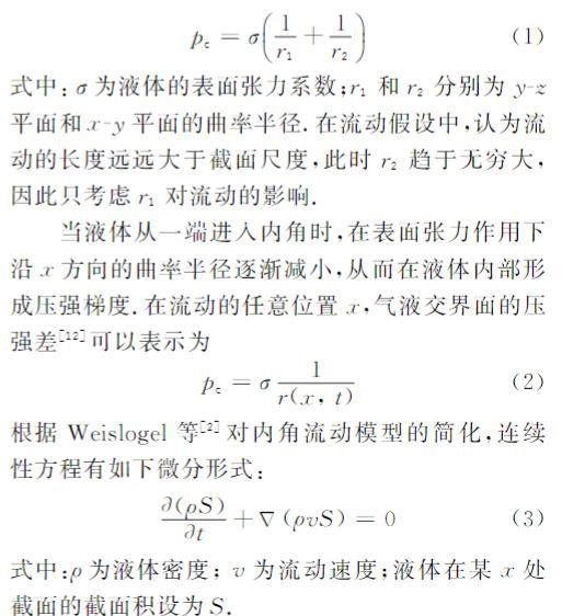 当液体从一端进入内角时,在表面张力作用下沿x方向的曲率半径逐渐减小,从而在液体内部形成压强梯度。在流动的任意位置x,气液交界面的压强差可以表示为