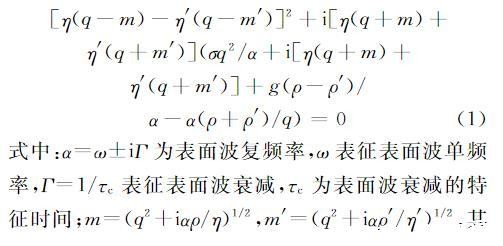 式中:α=ω±iΓ为表面波复频率,ω表征表面波单频率,Γ=1/τc表征表面波衰减,τc为表面波衰减的特征时间;m=(q2+iαρ/η)1/2,m′=(q2+iαρ′/η′)1/2,其中未知参数q、η、η′、ρ、ρ′分别为表面波波数、液相黏度、气相黏度、液相密度、气相密度;σ为表面张力。