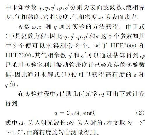 对于没有外界振动影响的气液界面(纯质也称为表面),由于分子的热运动引起密度涨落会在液面上形成波动,即表面波。表面波的波长为微米级,振幅为纳米级。表面波的波动特性由液体的表面张力、黏度和密度性质决定,通过对表面波色散方程的求解,即可以获得液体的表面张力和黏度,如下式所示