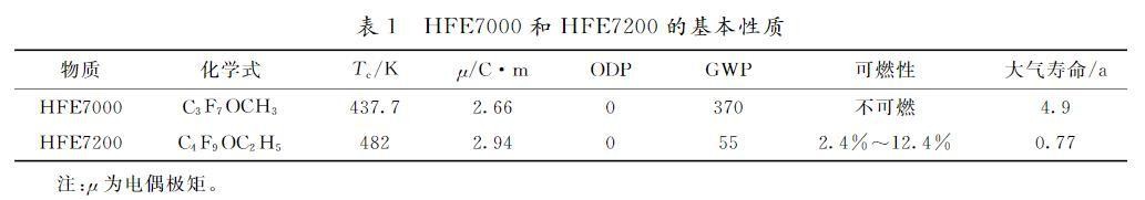 氢氟醚HFE7000、HFE7200具有良好的物化性质和环境性能,是多种化工合成物的原料。如表1所示,HFE7000、HFE7200的臭氧破坏潜能(ODP)均为0,温室效应潜能(GWP)分别为370和55,大气寿命为4.9和0.77 a。此外,HFE7000、HFE7200还具有高挥发性、低表面张力,可作为电子元器件的冷却介质,还可以替代HCFC-141b、HFC-43-10mee作为工业清洗剂。在能源领域,HFE7000还可作为朗肯循环工质,用来回收低温热源的低品位能量。