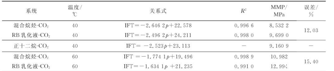 将拟合直线向横轴方向继续延伸,与压力轴会有一个交点,该交点的物理意义即界面张力为零时的压力大小。根据CO2的驱油机理和最小混相压力所表现的特征,该点的横坐标值即为实验对象在特定温度下的MMP。表2列出了40℃和60℃下所测气液之间的压力与界面张力的关系式和相关系数,以及对最小混相压力的预测。