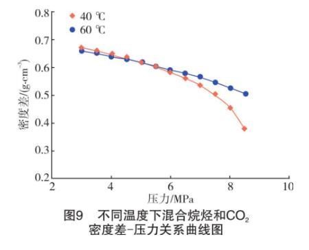 一方面,高温可以对液体分子之间的相互作用力产生削弱作用,加剧分子间的不规则运动。此时,CO2气体分子更容易与液相发生混溶,而定量表现出来的就是界面张力的降低。另一方面,根据混合烷烃和CO2的密度和二者的密度差数据,绘制出不同温度下CO2气体密度和气液密度差随压力升高的变化曲线,如图7~图9所示。从密度差-压力曲线(见图9)来看,随着温度升高,在可比较的实验压力范围内,中低压(3~6 MPa)下不同温度的气液密度差非常接近,可以忽略不计。但高于6 MPa后,高温下气液密度差逐渐加大。较高的密度差导致了气液难以形成混相,同一压力下界面张力更大。