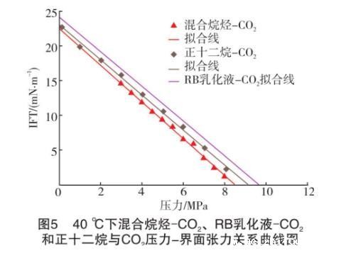 假设RB乳化液-原油不考虑斜率变化部分,始终以低压阶段(小于6 MPa)的斜率表示界面张力的变化。将表中同一温度下不同系统的关系式展现在曲线图上(见图5和图6)。从图5和图6可知,不论在哪个温度下,混合烷烃和RB乳化液的压力-界面张力曲线都接近平行,即两种油的界面张力随着压力的升高几乎以同样的速度降低。计算得知,40℃和60℃下实验混合烷烃和RB原油的压力-界面张力关系式中的斜率误差为6.0%和8.6%。纵观两种油的组成发现,本实验所使用的混合烷烃中正十二烷的摩尔分数达71.07%,而RB原油中的C12+的摩尔分数达到57.66%。也就是说,混合烷烃和原油的组分中占主导作用的是高碳数的正构烷烃。据姬泽敏等的大量实验研究,界面张力在不同的正构烷烃-CO2体系中具有极好的规律性,在相同的温度压力条件下,正构烷烃的碳数和界面张力成正比关系。从文献中RB原油组成分析得知,C12+的分子量高达366 g/mol,而本实验中的混合烷烃的分子量仅为156.74 g/mol。由此得知,实验误差的主要来源是高碳正构烷烃的组成不同。