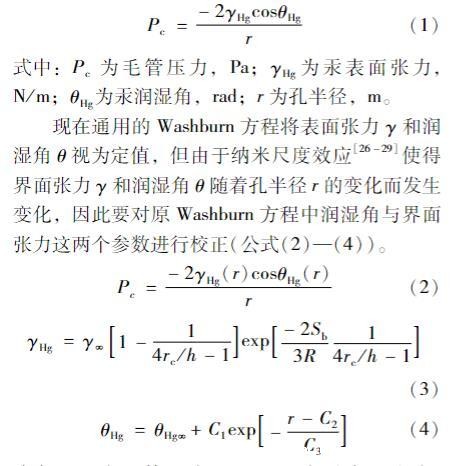 现在通用的Washburn方程将表面张力γ和润湿角θ视为定值,但由于纳米尺度效应使得界面张力γ和润湿角θ随着孔半径r的变化而发生变化,因此要对原Washburn方程中润湿角与界面张力这两个参数进行校正(公式(2)—(4))。