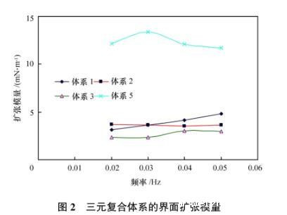 碱能够溶蚀界面膜、与原油反应生成表面活性物质,协同表面活性剂降低界面张力,这是碱降低界面张力的原因。加入碱后溶液中电解质浓度增大从而加强了表面活性剂分子在体相及界面间的扩散交换作用,会降低界面扩张模量。体系4与体系3相比仅增加了碱的浓度,界面张力和界面扩张模量都得到了降低。体系2和体系5只改变了表面活性剂的类型,2个体系降低界面张力和界面扩张模量的能力存在很大差别:表面活性剂为重烷基苯磺酸盐的体系2降低界面扩张模量能力强而降低界面张力作用弱;表面活性剂为石油磺酸盐的体系5降低界面张力作用强而降低界面扩张模量能力弱。这种差别与表面活性剂的结构及其在界面上的相互作用方式有关:表面活性剂分子在界面上被吸附的浓度高,则界面张力降低多;吸附在界面上的表面活性剂之间及表面活性剂与界面膜上其他物质之间的相互作用和弛豫过程决定了界面扩张模量的大小。