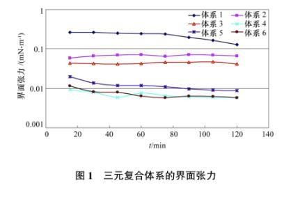 体系1、体系2、体系3可以构成界面张力不同而界面扩张黏弹性相同的对比实验;体系4、体系5、体系6可以构成界面张力相同而界面扩张黏弹性不同的对比实验。