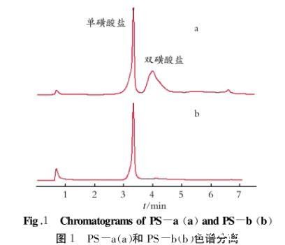 从色谱图及色谱数据分析结果得知:PS-a和PS-b均含有单磺酸盐和双磺酸盐,但两者所含单、双磺酸盐的量差别较大;如果以峰面积为评价标准,样品PS-b中几乎不含双磺酸盐部分,而样品PS-a中单、双磺酸盐所含比例相当,约为1∶1。
